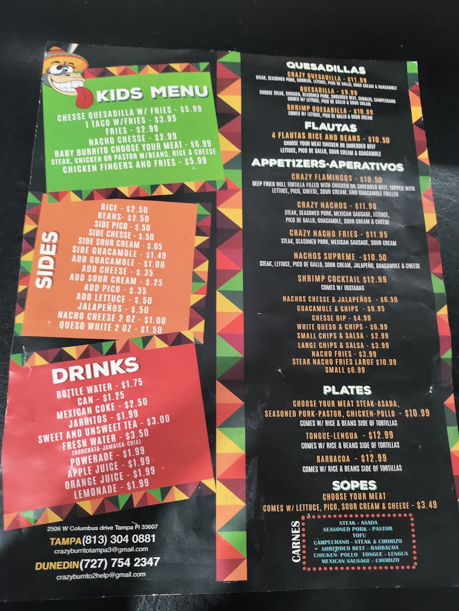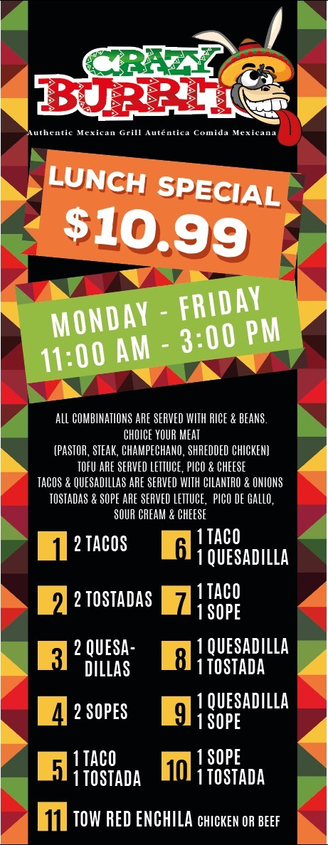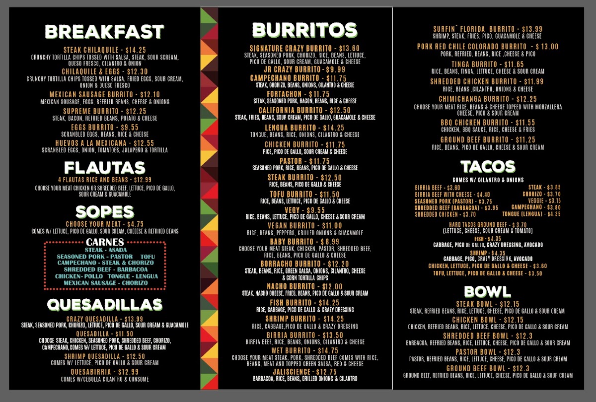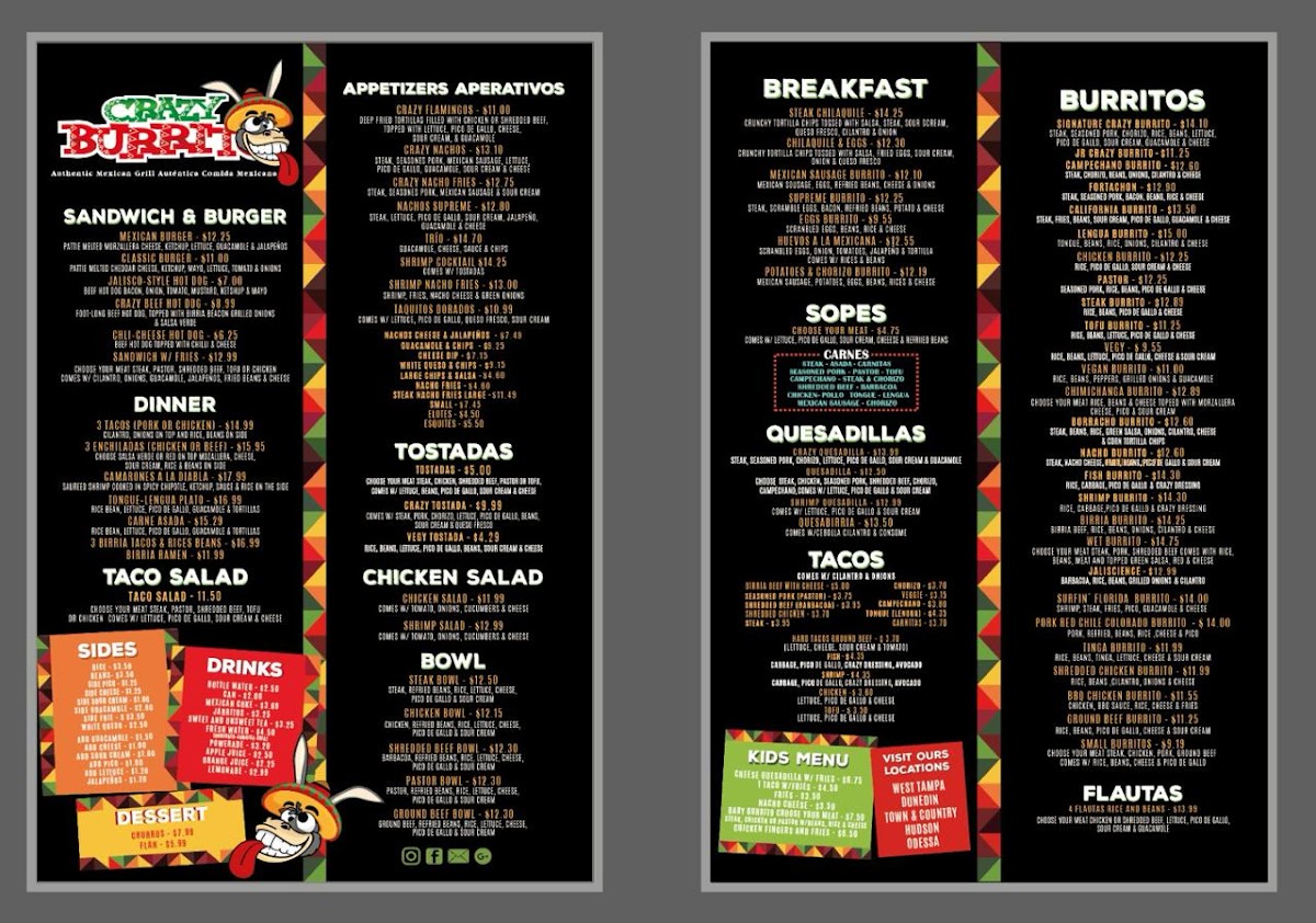 At Crazy Burrito Authentic Mexican Grill, you’ll find a menu full of vibrant flavors that transport you straight to the heart of Mexico. Located in the heart of Dunedin, FL, this spot is all about fresh, bold, and authentic Mexican dishes. From sizzling burritos to mouthwatering tacos, every item is crafted with high-quality ingredients, bringing the taste of real Mexican street food to your table. Whether you’re in the mood for a hearty burrito stuffed with all your favorite fillings or a zesty taco topped with tangy salsa, the options here are sure to satisfy your cravings. Every bite promises a perfect blend of savory, spicy, and refreshing flavors, giving you a true taste of Mexico in every meal. So, dive into the Crazy Burrito Authentic Mexican Grill Dunedin Menu and experience the deliciousness for yourself!